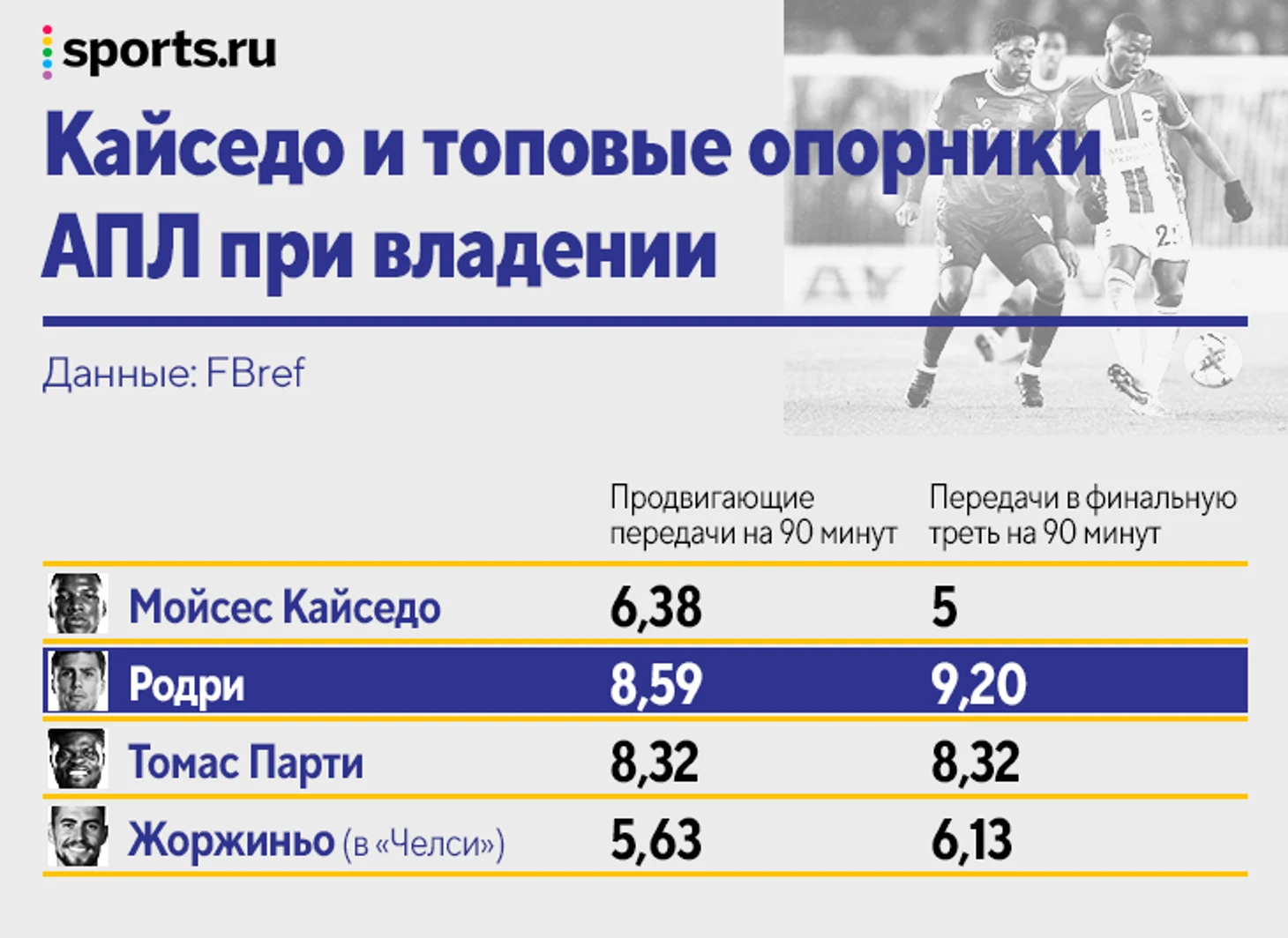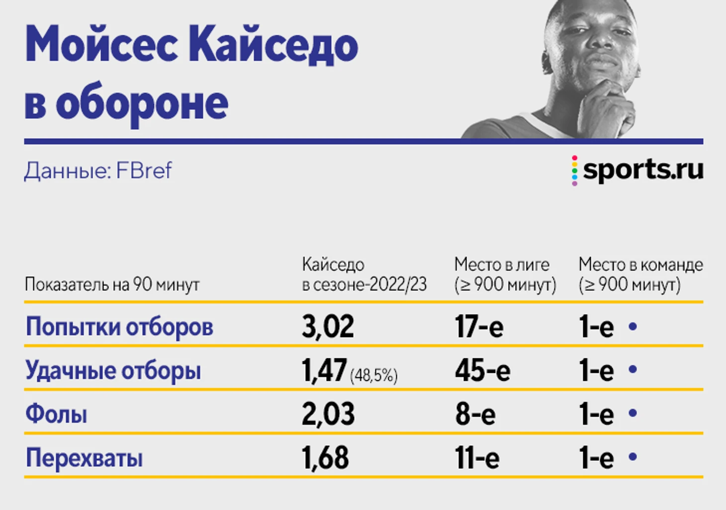 При владении заслуги Кайседо скромнее из-за роли в «Брайтоне». Он полезен при выходе из обороны как промежуточный элемент, но реже сам становится конструктором атак. 50% его передач – короткие, а больше касаний в штрафной и на своей трети делают только центральные защитники.
