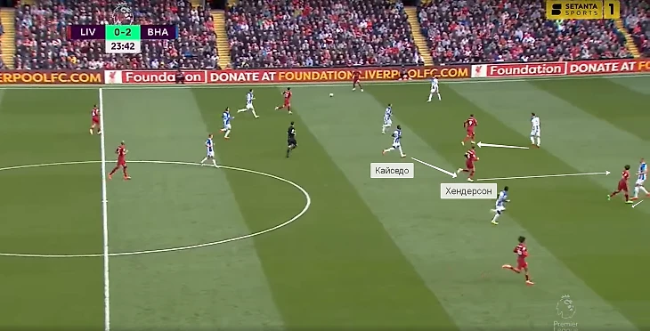 Похожая ситуация произошла в гостевом матче с «Ливерпулем». Данк и Уэбстер опекали Фирмино и Салаха – Хендерсон пытался открыться на свободном пространстве.