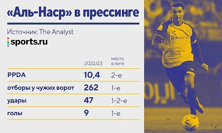 «Аль-Наср» – одна из самых интенсивных команд лиги без мяча. Роналду отдыхает чаще партнеров, но имеет важную роль в прессинге