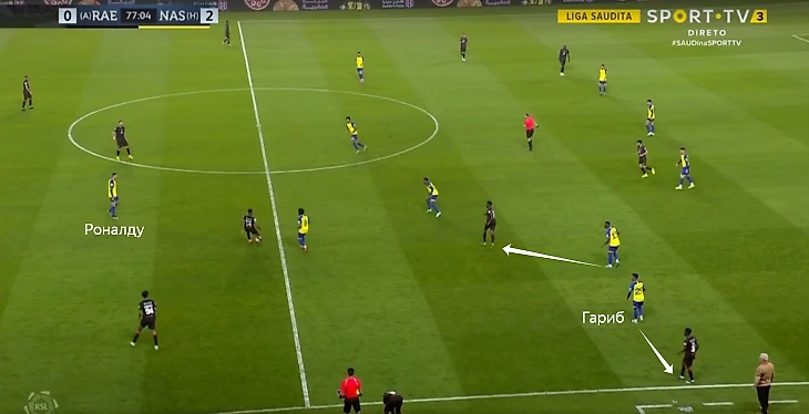 А в этом случае Роналду опустился в центр поля и отдал тонкий разрезающий пас на Гариба. В итоге Аль-Сулайхим бил из штрафной, но его удар заблокировал защитник.