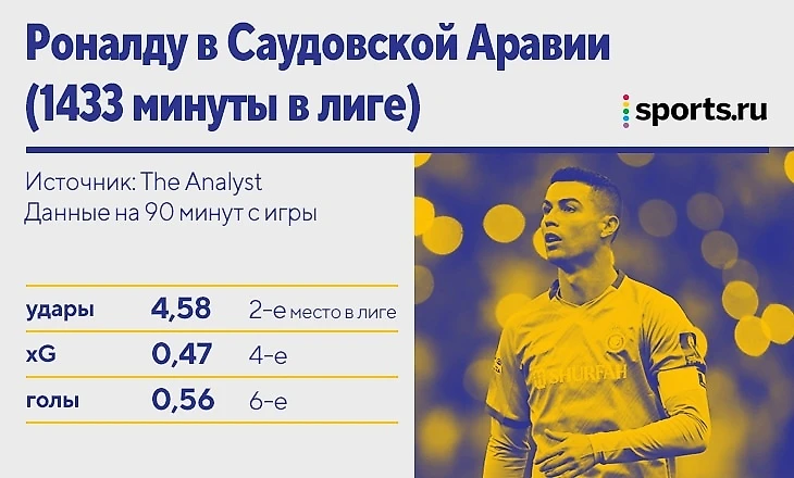 Старт Роналду в цифрах можно описать как многообещающее начало – пока Криштиану не выглядит на уровень выше новой лиги. Он привычно много бьет (уступил только Талиске), а по xG и голам с игры за 90 минут подобрался к лидерам.