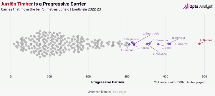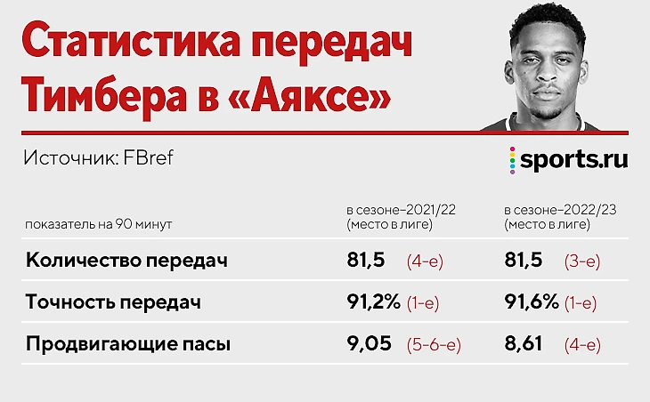 Тимбер активно участвовал в подготовительной фазе, когда направлял мяч в нужные зоны (стабильно высокие показатели количества и точности передач). Одновременно голландец влиял на развитие атаки через нетипичные решения с поиском свободных зон (выдавал сильные для центрального защитника цифры по продвигающим пасам).