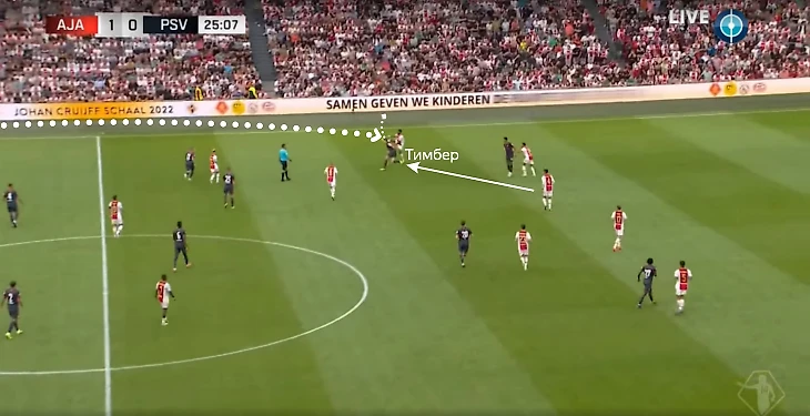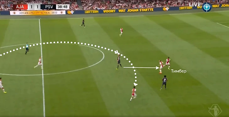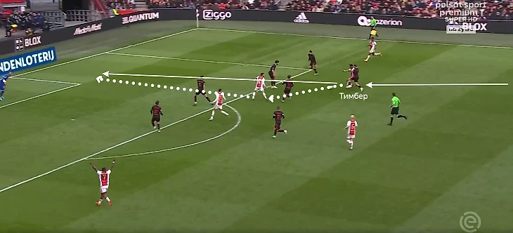 Другой пример – после обратной передачи Бергейса Тимбер в касание нашел Тайлора между линиями. Впоследствии «Аякс» быстрым розыгрышем создал голевой момент.