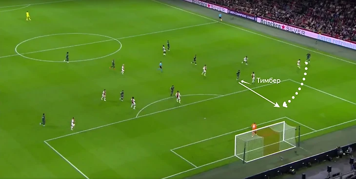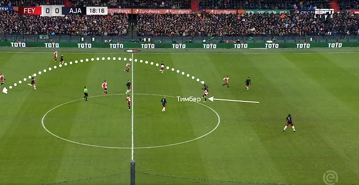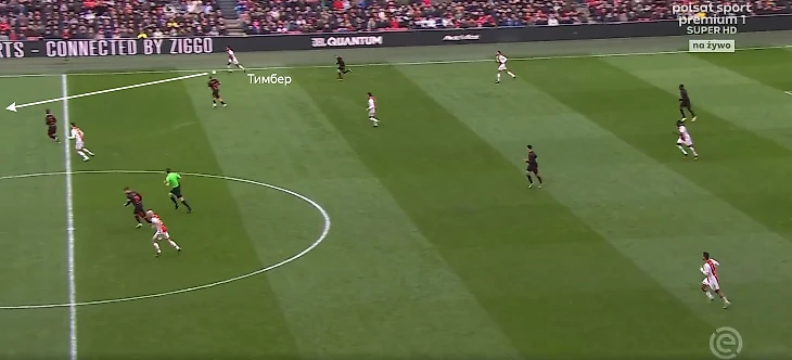 Здесь «Аякс» накрыл «Фейеноорд» высоким прессингом, поэтому последовала длинная передача. Тимбер вовремя выдвинулся и опередил Джаханбакша (180 сантиметров).