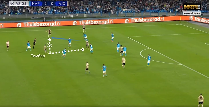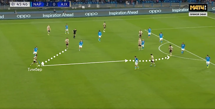 А против «Наполи» решение Юрриена перевернуло ситуацию. После улучшения позиции голландец мог без риска отдать на фланг (соперник был к этому готов). Вместо простой передачи Тимбер продолжил атаку через насыщенную зону.