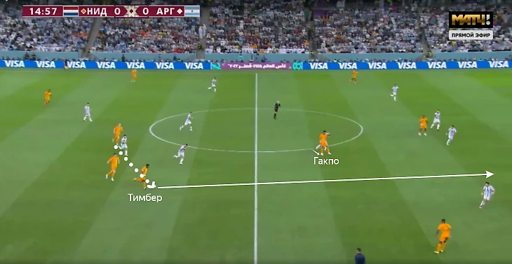 В сборной Юрриен изначально получил удобные условия и делал подобные забеги с позиции правого центрального защитника в схеме 3-4-1-2. Против Аргентины Де Йонг вывел его на пространство, а Гакпо в этот момент находился под опекой Энцо.