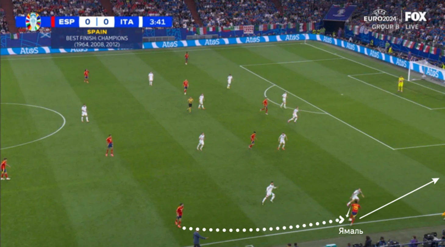 Поэтому изоляции для Ямаля – логичный шаг. Он разгоняется, сам двигается в сторону игрока и не оставляет ему возможности плассироваться. Когда тот выдергивается, Ламин резко уходит в сторону и уже в приличном темпе летит к штрафной.