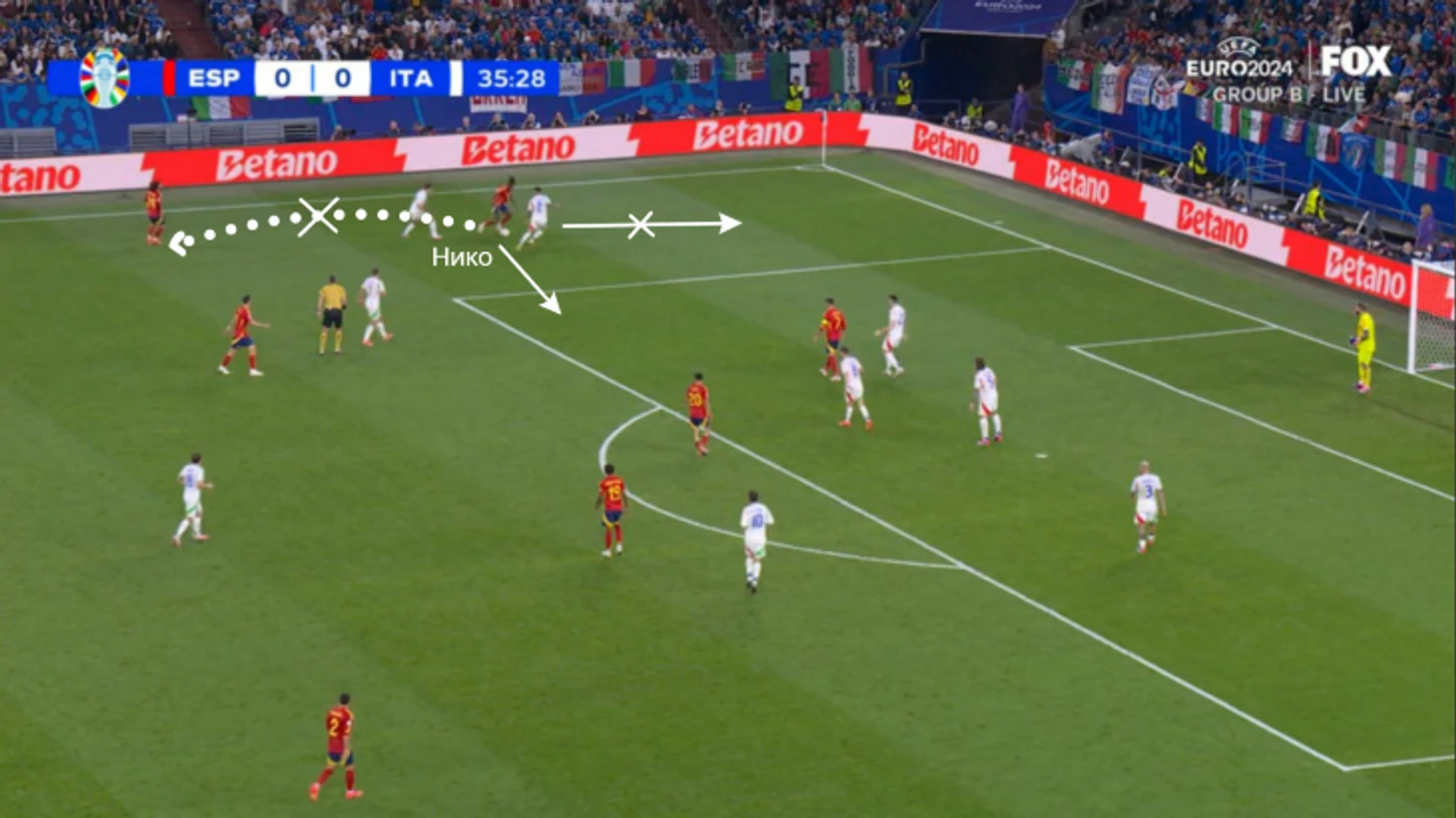 Против Хорватии они опекали крайних защитников, иногда переключались на центральных (когда Альваро Мората доигрывал до вратаря) и смещались на подстраховку в центр, если мяч находился на дальнем фланге. В игре с Италией Нико и Ламин перекрывали Джованни Ди Лоренцо и Риккардо Калафьори (крайних в тройке в начале атаки) и иногда помогали зажимать соперника во фланговой ловушке.