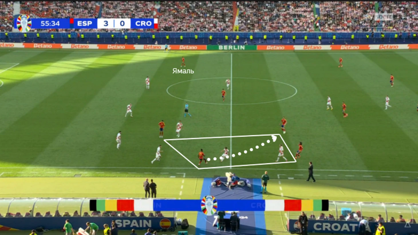 Вот против Хорватии слева сразу четыре игрока. Фабиан Руис оказался свободен и через Дани Карвахаля подключил Ямаля к владению.