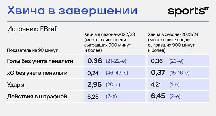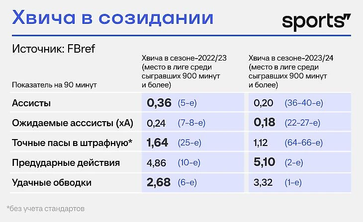Более объемная роль впереди повлияла на созидание: Хвича сбавил в контексте ожидаемых ассистов и точных пасов в штрафную с игры. Хотя даже здесь есть позитив – выросли цифры по предударным действиям (выше в лиге оказался только Матиас Соуле) и удачным обводкам (и вовсе лидер).