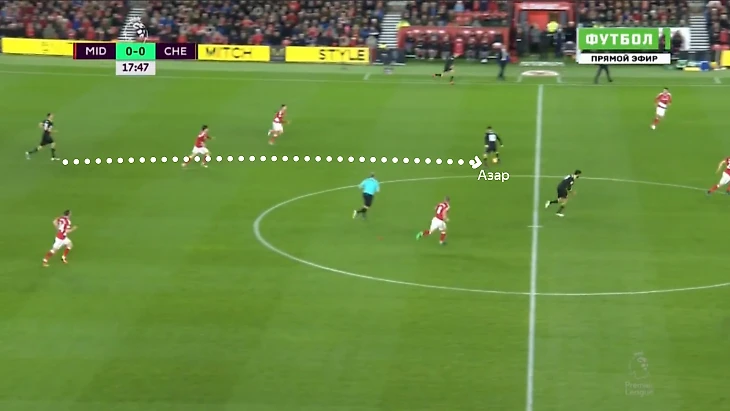 Подобные розыгрыши проходили не только в контратаках. Против «Мидлсбро» Эден оказался без опеки на огромном пространстве при выходе из обороны и протащил мяч к штрафной.