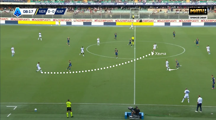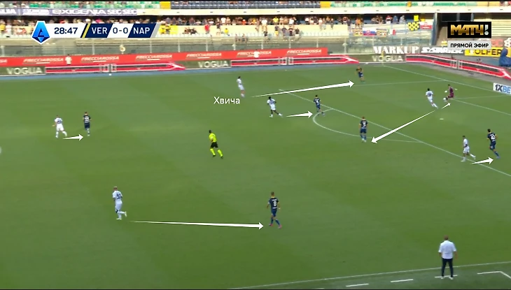 Против «Вероны» при 67% владения таких случаев было немного, но в период давления «Наполи» разбирал игроков 1-в-1 и оказывал давление на вратаря Лоренцо Монтипо. «Верона» часто прибегала к дальним передачам – это и есть цель Конте. Хвича накрывал центрального защитника Павла Давидовича.