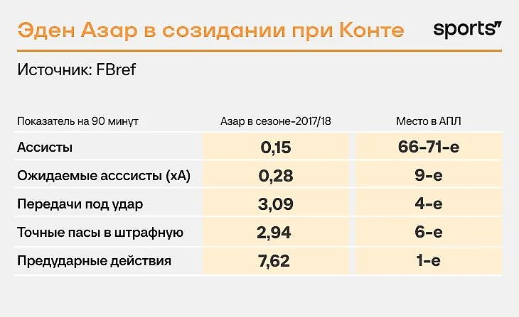 А после приема бельгиец продвигал мяч на рывках или раскачивал соперника корпусом. Неслучайно Азар в сезоне-2017/18 с отрывом стал лучшим в лиге по удачным обводкам за игру – 6,13 (у второго Софьяна Буфаля из «Саутгемтона» только 4,52).