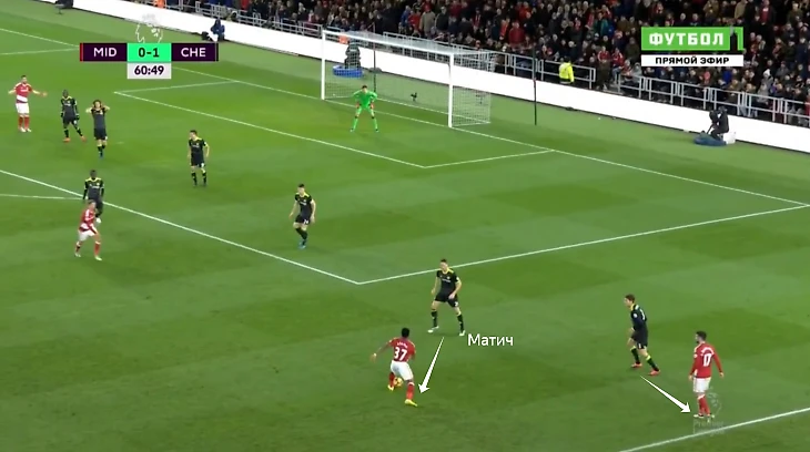 Конте понадобился большой объем от опорников. Кто-то из них помогал левому латералю Маркосу Алонсо не оставаться в изоляциях или в численном меньшинстве. Как Неманя Матич в этом эпизоде: опустился в линию и не дал разогнаться Адама Траоре.