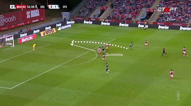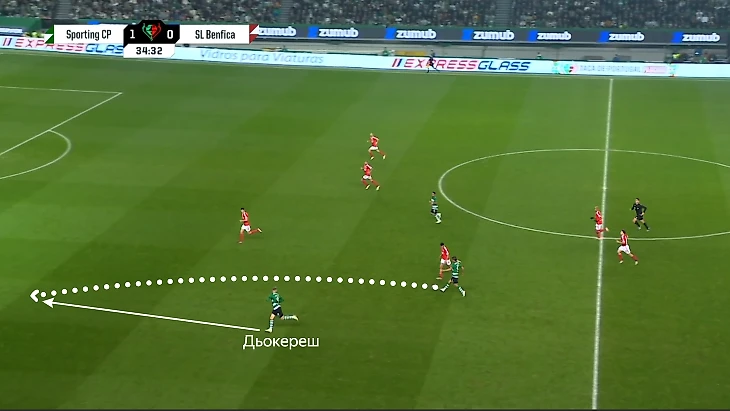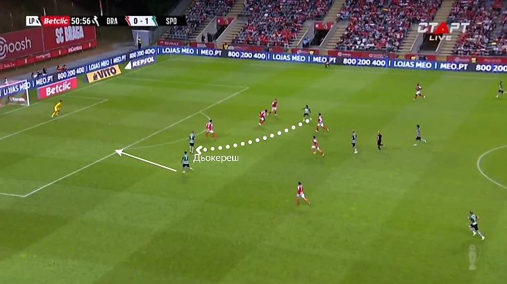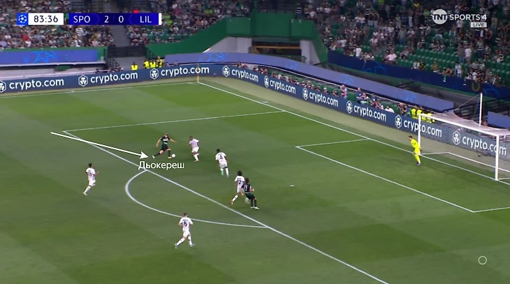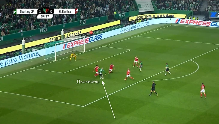 Фиксируем: Дьокереш в «Спортинге» получил роль форварда в 3-4-2-1 с разноплановым движением (активно открывается в штрафной, уходит ниже в центр или смещается на фланги). Поэтому угроза возникает из любой точки и в разных сценариях: кроссы, рывки за спину или проходы на ведении