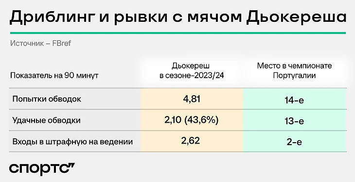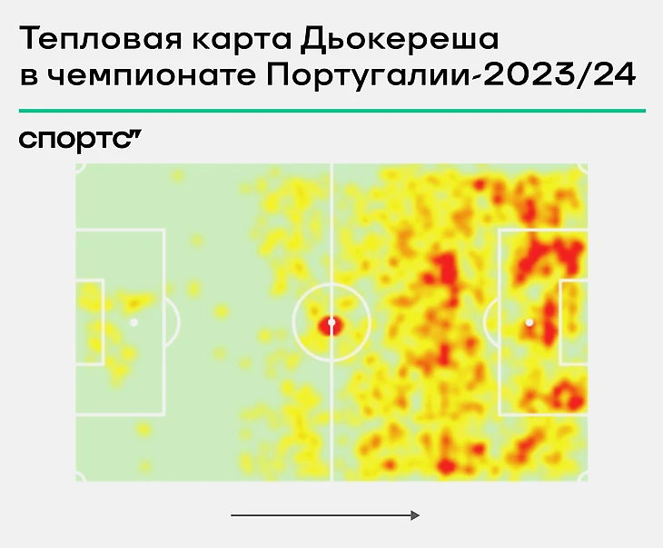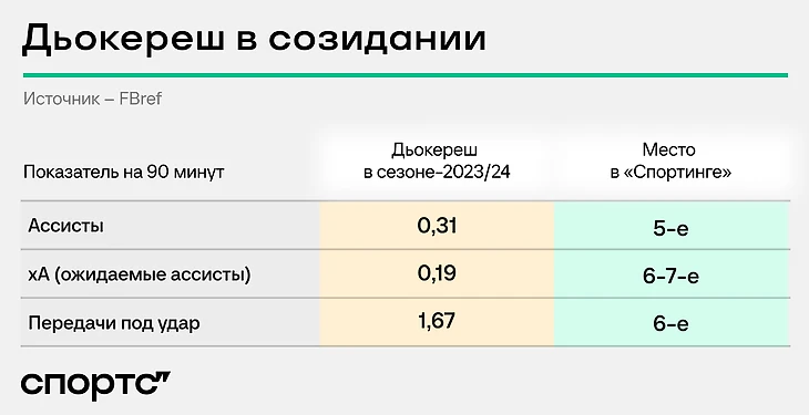 По основным показателям в созидании в абсолютных значениях Дьокереш стабильно входил в топ-3 «Спортинга» в прошлом сезоне. При пересчете на 90 минут это выглядит уже не так впечатляюще, но Дьокереш все равно рядом с топ-5. А ведь он конкурирует с инсайдами и латералями, изначально нацеленными на обострение.