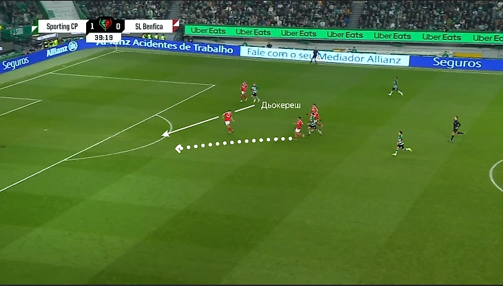 Даже наоборот: агрессия Виктора помогала «Спортингу» возвращать мяч в не самых очевидных эпизодах. Против «Бенфики» центральный защитник Эдуарду Куарежма после прохода в контратаке потерял мяч. Александер Ба откатил мяч чуть в сторону, но Дьокереш не наблюдал со стороны, а сразу сделал движение.