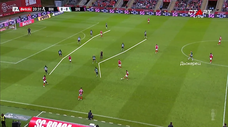 При более агрессивном плане «Спортинг» обычно начинает персональное давление после паса назад и напрягает вратаря. Часто этим занимается как раз форвард. Но ему нужно еще и одновременно перекрывать направление паса на одного из защитников.
