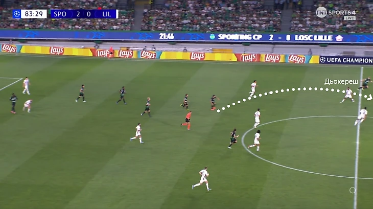 Что нужно запомнить? В обороне Дьокереш закрывает зону в среднем блоке или во время прессинга опекает одного из соперников с выдергиваниями на вратаря. Он редко экономит силы, а иногда благодаря нужной агрессии возвращает мяч «Спортингу» сразу после потери.