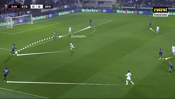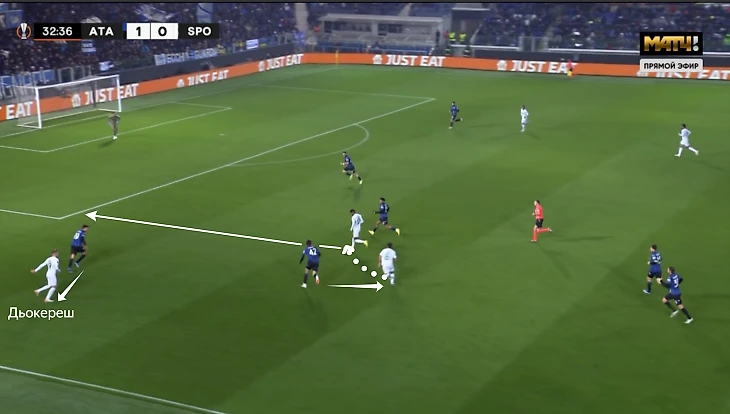 Пример из прошлогоднего матча с «Аталантой». Дьокереш накрыл Хуана Муссо и не дал развернуть атаку на Берата Джимшити левее. Хозяев в итоге выручило смещение Тена Копмейнерса ниже, но Виктор свою работу сделал грамотно.