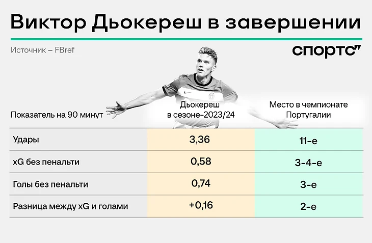 Как все работает? Во-первых, Дьокереш неизменно становится адресатом для навесов или прострелов и активно открывается у ворот. В прошлом сезоне по действиям внутри штрафной (8,7 на 90 минут) никто в лиге не опередил Виктора. Ближайшие преследователи – Франсишку Консейсау из «Порту» (8,0) и тот же Паулинью (7,1).