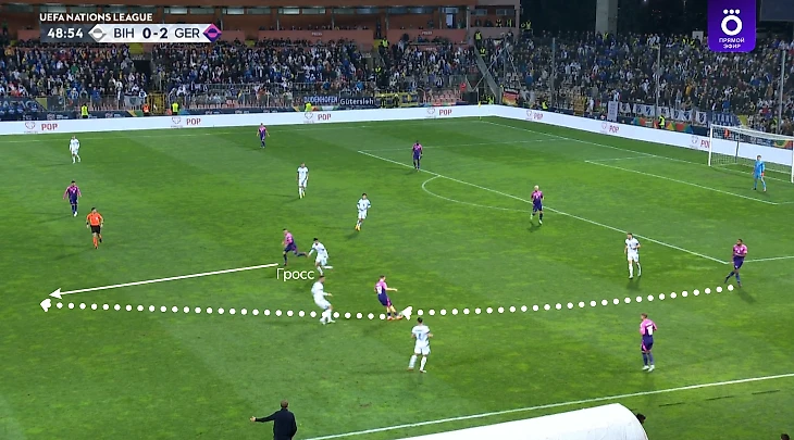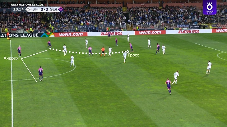 Против Боснии еще в момент паса Джонатана Та на Виртца опорник «Боруссии» уже начал движение за спину Адриану Баришичу. Флориан в касание подключил Гросса – хозяев выручил только отчаянный подкат Беньямина Тахировича.