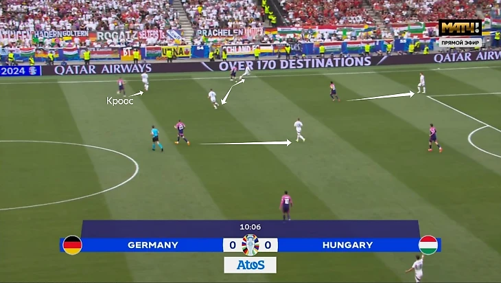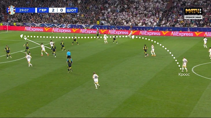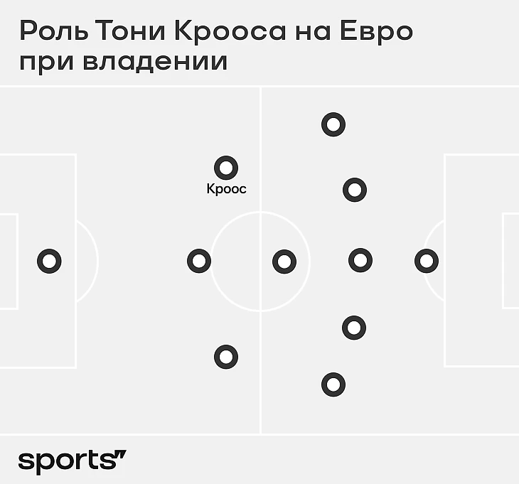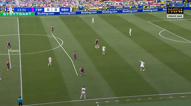 Фиксируем: на Евро Тони стал ключевым игроком Германии при владении в роли левого центрального защитника в 3-1-5-1. Он управлял темпом, искал десяток между линиями и переводил мяч направо для смены направления атаки.