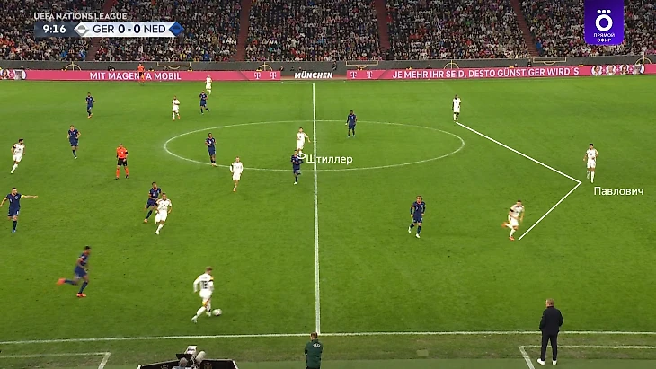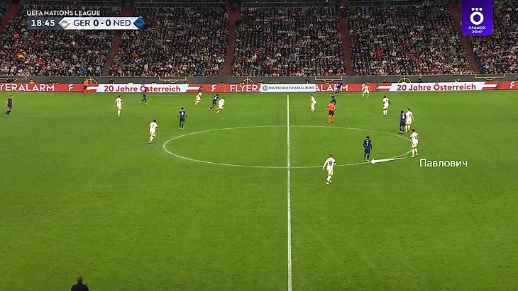 Кстати, дома против Нидерландов Александар Павлович (единственный выход в старте) в такой же манере опускался между Антонио Рюдигером и Нико Шлоттербеком, а Анджело Штиллер открывался над ними. В перерыве Нагельсманн выпустил Андриха в опорную зону, а хавбека «Баварии» отправил выше.