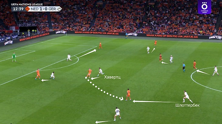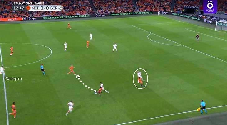 Не таким монолитным сейчас кажется и прессинг Германии. Нидерланды в домашней игре несколько раз вскрывали их структуру через смену позиций и смещения ниже Хави Симонса.