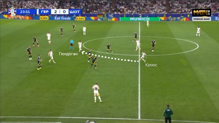 От Крооса требовались своевременные и удобные пасы. Как на Гюндогана против Шотландии (5:1), когда Тони отрезал всю полузащиту. Илкай после приема покатил налево Макси Миттельштедту, и после прострела Мусиалу срубили почти на линии штрафной.