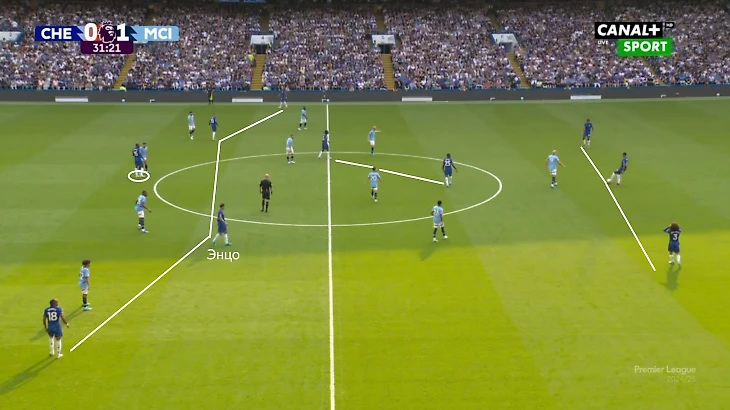 В обороне же Мойсес становился правым защитником, а аргентинец опускался в центр поля в пару к Лавии. Против «Астон Виллы» Энцо опекал опорника Бубакара Камара, а эквадорец выдергивался на Люка Диня и поддерживал компактность в последней линии (если Ливай Колуилл или Уэсли Фофана шли в отбор).