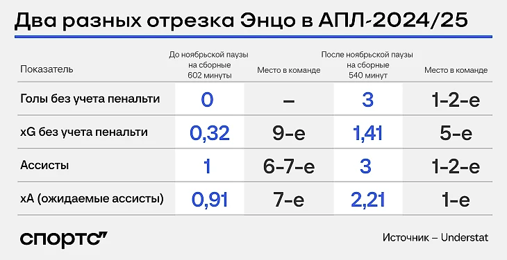 Но после ноябрьского перерыва на сборные все резко изменилось. Энцо вернулся в основу и забивал или делал ассист в каждом матче (кроме 0:0 с «Эвертоном»). Вот как это отразилось на статистике.