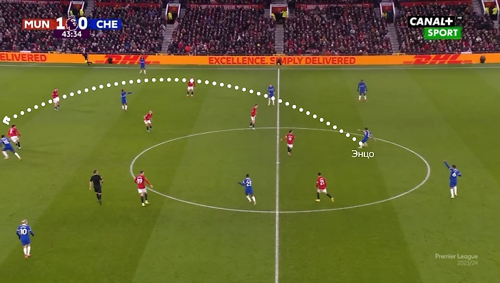 Вот одна из самых популярных комбинаций «Челси» в прошлом сезоне. Энцо из опорной зоны видит рывок Николаса Джексона и делает закидушку.