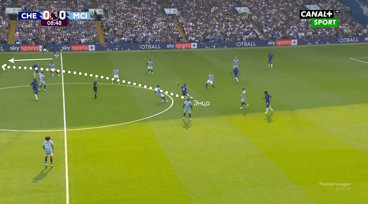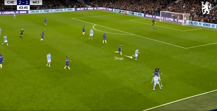 К чему это приводит? Во-первых, «Челси» допускает слишком много пространства между линиями. Энцо иногда излишне ориентирован на мяч и не оценивает ситуацию вокруг.