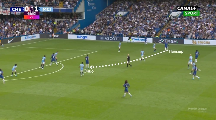 Пример одной из таких комбинаций: Коул Палмер увидел свободного Энцо в середине и отправил его на поход в штрафную. Из-за плохой обработки аргентинец так и не создал остроту, но само открывание стоит оценить.