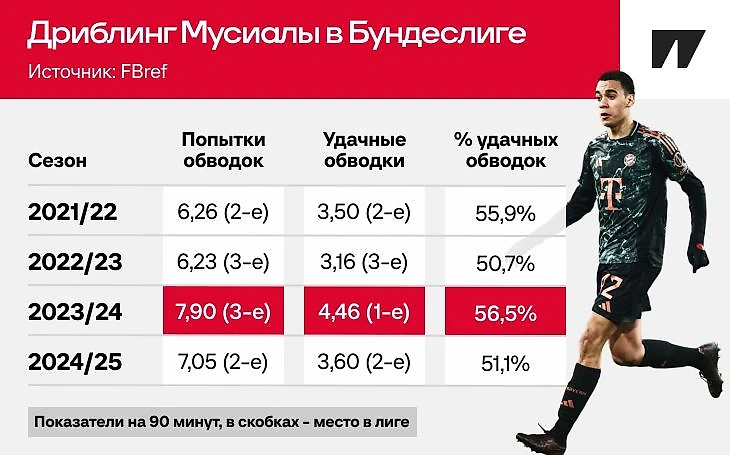 После полноценного дебютного сезона (больше 1000 минут в лиге) Джамал не выпадал из топ-3 Бундеслиги по попыткам дриблинга и удачным обводкам. Удивительная стабильность.
