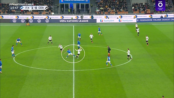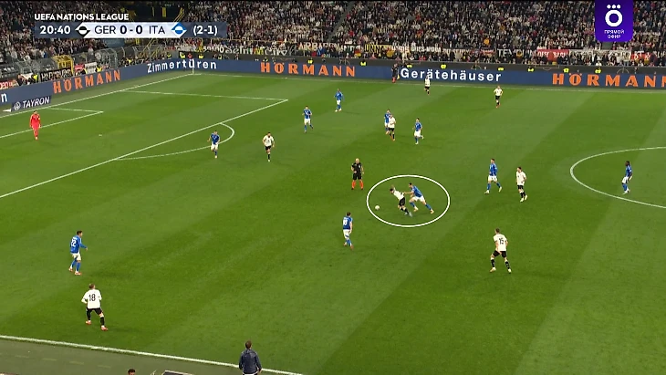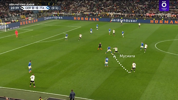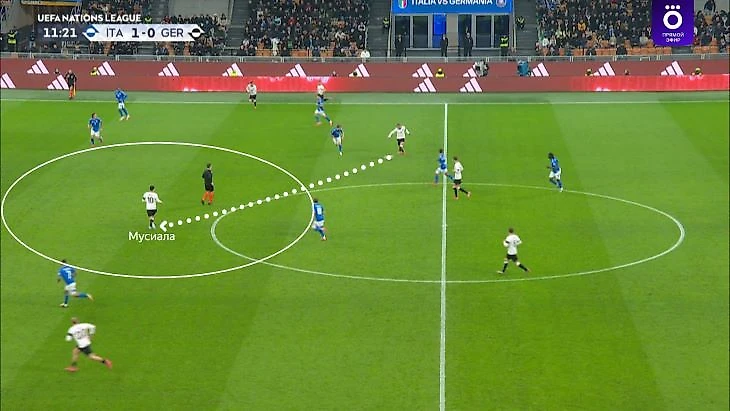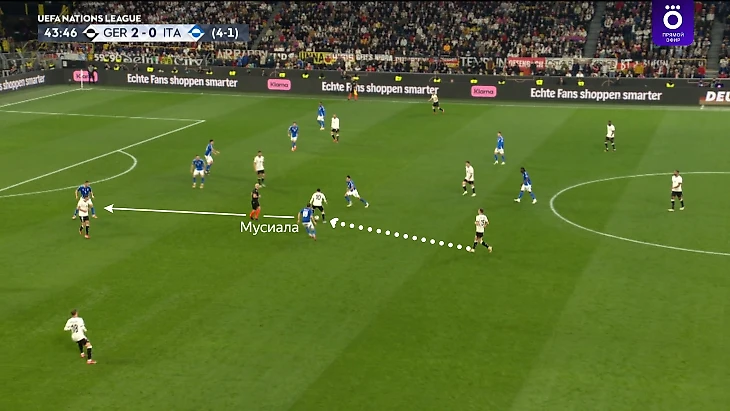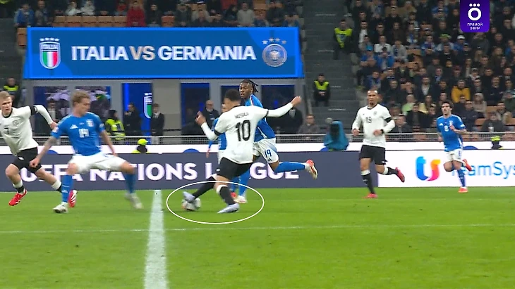 В похожей манере пострадала Италия в Лиге наций (3:3). Мусиала по эпизоду оказался между Николо Бареллой и Самуэле Риччи и очень ловко избавился от давления.