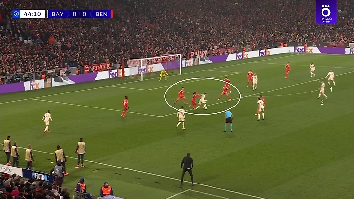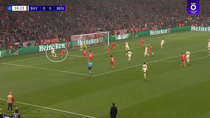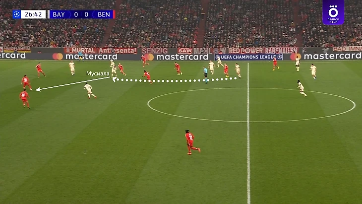 Против «Бенфики» в ЛЧ (1:0) «Бавария» вернула владение после аута. Жоау Пальинья отдал на Мусиалу, который оценил положение опорника гостей Фредрика Эурснеса и развернулся корпусом левее.