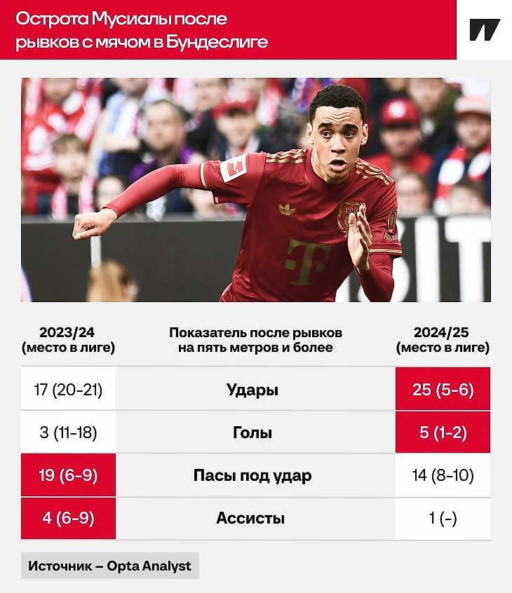 Эти действия помогают «Баварии» создавать моменты. В сезоне-2023/24 Джамал попал в топ-10 Бундеслиги по пасам под удар и ассистам после рывков на пять метров и более.