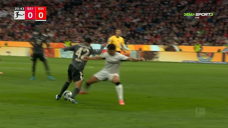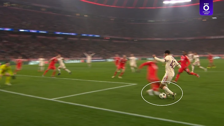 Так Джамал пытался уйти от Отаменди почти во вратарской после разрезающего паса Майкла Олисе. Мусиала в последний момент переложил мяч с правой на левую, но из-за столкновения не смог проникнуть дальше.