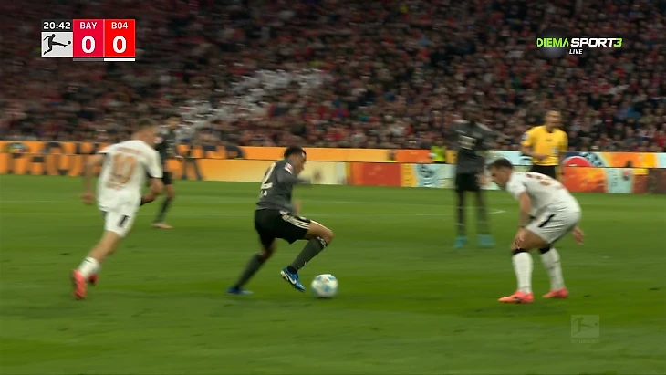 Джамал пользуется любыми разрывами в структуре соперника или недостатками ее компактности, а после приема тащит мяч на рывке или пролезает вперед через обводки. Сейчас в Бундеслиге по принятым продвигающим передачам (7,74 на 90 минут) его опередил только Флориан Виртц (7,83).