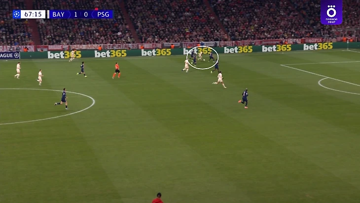 Добавим несколько свежих примеров. «ПСЖ» потерял мяч слева, и Мусиала устремился к штрафной, но оказался в окружении Маркиньоса, Ашрафа Хакими и Жоау Невеша. Джамал не растерялся и сохранил владение через пас чуть назад на свободного Альфонсо Дэвиса.