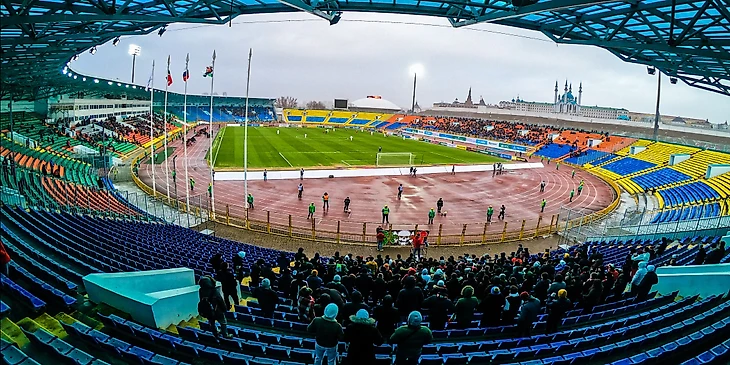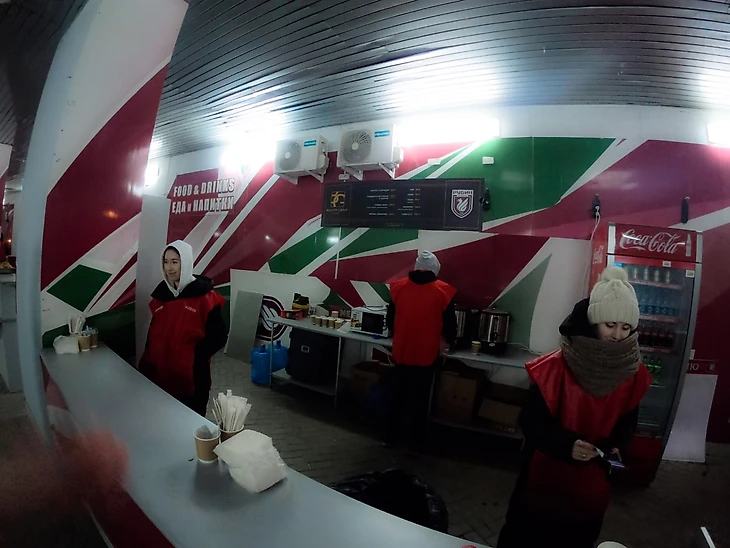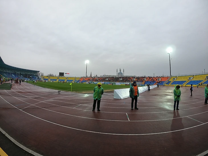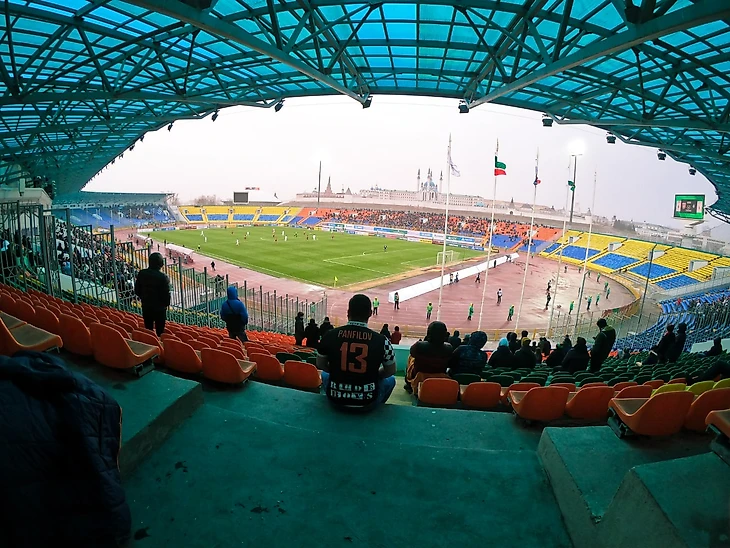 Крыша, которая покрывает ровно половину стадиона протекает в некоторых местах. Билеты рекомендую брать на западную трибуну, у вас откроется неплохой вид на Казанский Кремль. На трибуне между секторами стоят заборы, но калитки в них открыты, поэтому у меня не составило труда перебраться с Западной трибуны на Южную и обратно. Экран убитый, на нем пытались показывать видео перед игрой, очень напомнило просмотр VHS. Звук тоже оставляет желать лучшего, сильно фонит.