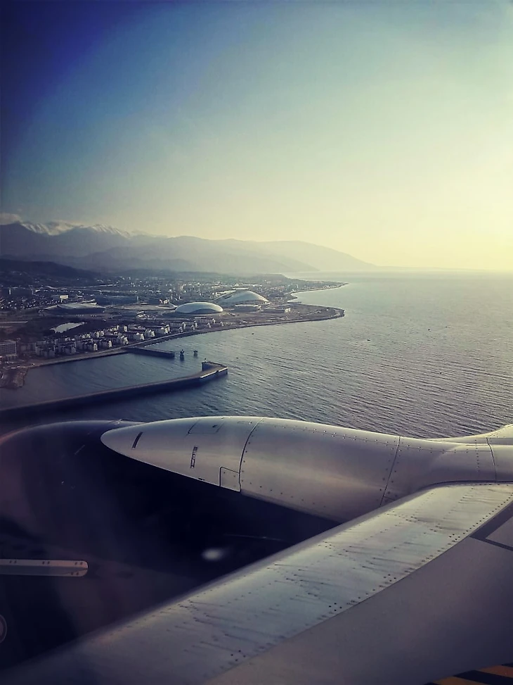 Добрался я наконец до этого обзора. Пусть немного с задержкой, но лучше поздно, чем никогда. Перелет в Сочи (Адлер) мне обошелся в 6000 рублей - прямой "Аэрофлот" туда-обратно. Уже подлетая к аэропорту можно рассмотреть силуэт стадиона.