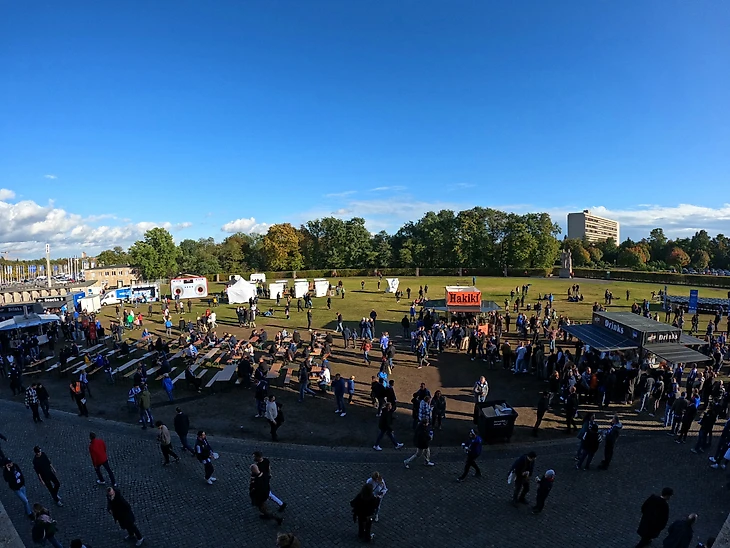 При входе на стадион нас встречают две гигантские колонны между которыми растянуты олимпийские кольца, и мы сразу понимаем, что будем иметь дело с большим стадионом и скорее всего беговыми дорожками. Проход на территорию достаточно плотный, очень много людей, досмотр тщательный. Пройдя на территорию самого стадиона попадаем на гигантский фудкорт. Теперь понятно почему многие приезжают сюда настолько заранее. Тут огромный выбор еды, закусок, напитков и конечно же пива. Пиво льется просто ручьями изо всех кранов. И даже если у вас вдруг закончится пиво в стакане, вам нужно будет пройтись до любой палатки и там оно будет, причем выбор достаточно широк. Средняя цена 5€, литровые кружки по 10€. Если вы потом пополняете, то уже, платите на 2€ меньше, так что не выбрасывайте стаканы.