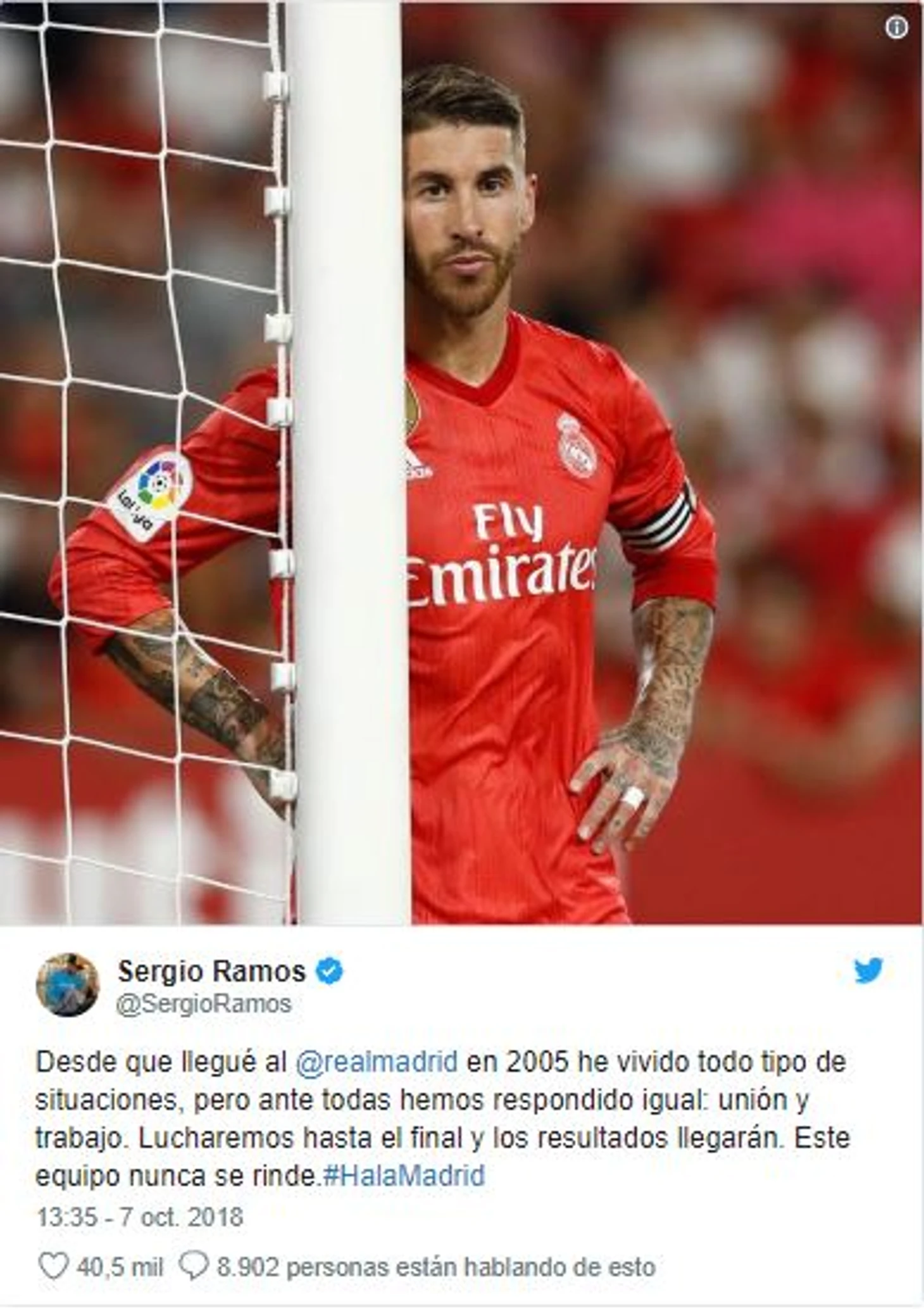 Серхио Рамос поделился в Твиттере своими переживаниями после поражения в матче с "Алавесом". Капитан сливочных отправил оптимистическое послание болельщикам во времена не самых лучший результатов команды Лопетеги, которая не может ни победить, ни даже забить уже 4 матча подряд. Рамос заверил, что это не первый кризис, который переживает команда, и что она всегда выходит из него, усердно работая как одна семья.