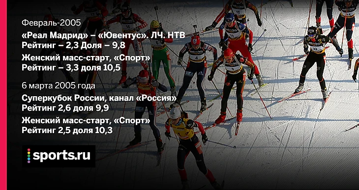 В феврале 2005 года женский масс-старт на «Спорте» был популярнее, чем матч «Реал» – «Ювентус» на НТВ, а некоторые январские трансляции (например, мужской спринт) лишь немного недотягивали до трансляции матча Кубка УЕФА «Бенфика» – ЦСКА на «Первом канале» (рейтинг – 3,0 против 3,2, доля – 16,6 против 19). В марте 2005-го был еще более показательный момент: матч за Суперкубок России, показанный в прямом эфире «России», был почти на одном уровне с женской гонкой преследования, которая прошла в тот же день на «Спорте» (рейтинг – 2,6 против 2,5, доля – 9,9 против 10,3).