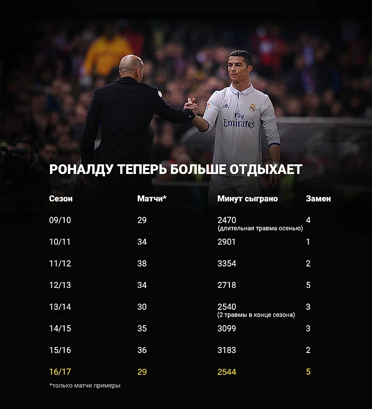 Во второй части сезона именно система ротации Зидана позволила Роналду быть настолько свежим. Чтобы уничтожать соперников в важнейших матчах, Роналду пропускал игры с маленькими командами и больше времени тратил на качественное восстановление.