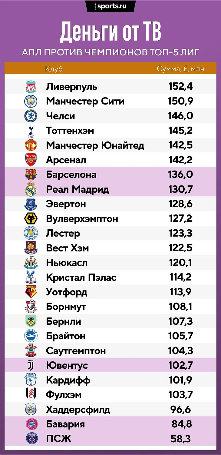 Мы сравнили телевизионные доходы чемпионов остальных топ-4 лиг Европы с доходами всех клубов АПЛ.