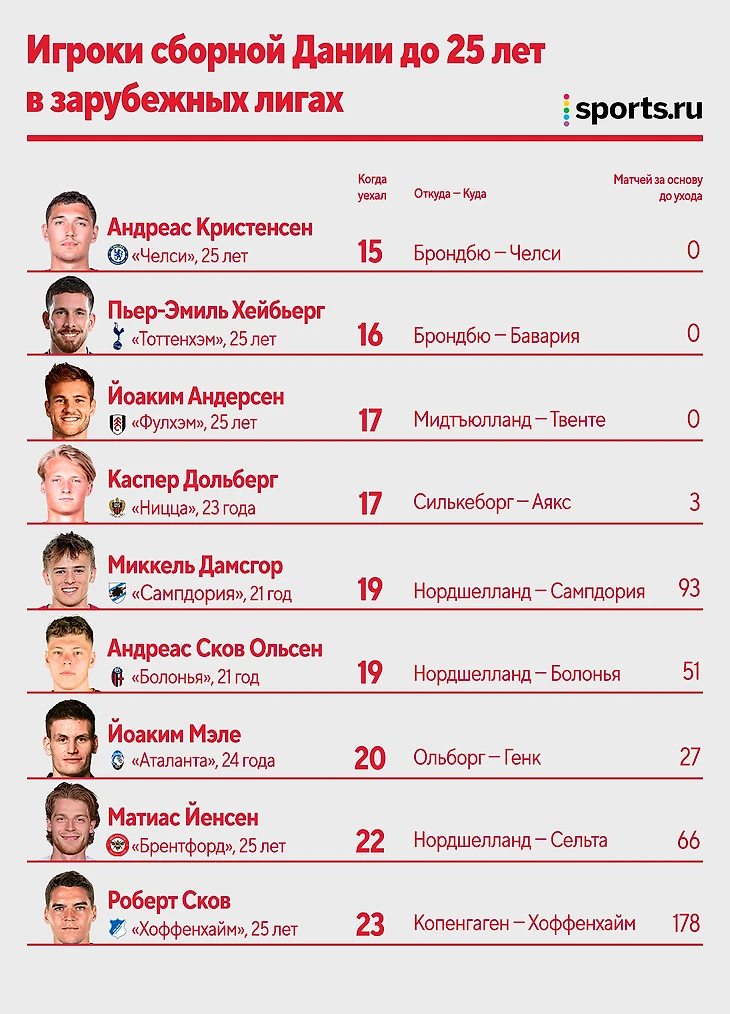 • «В этом году у нас рекорд по количеству игровых минут датских игроков в топ-5 лигах Европы», – продолжает Берг. В сборной Дании 10 футболистов в возрасте до 25 лет – 9 из них играют в Италии, Франции, Германии, Испании или Англии. Причем большинство уехало до 20 лет.